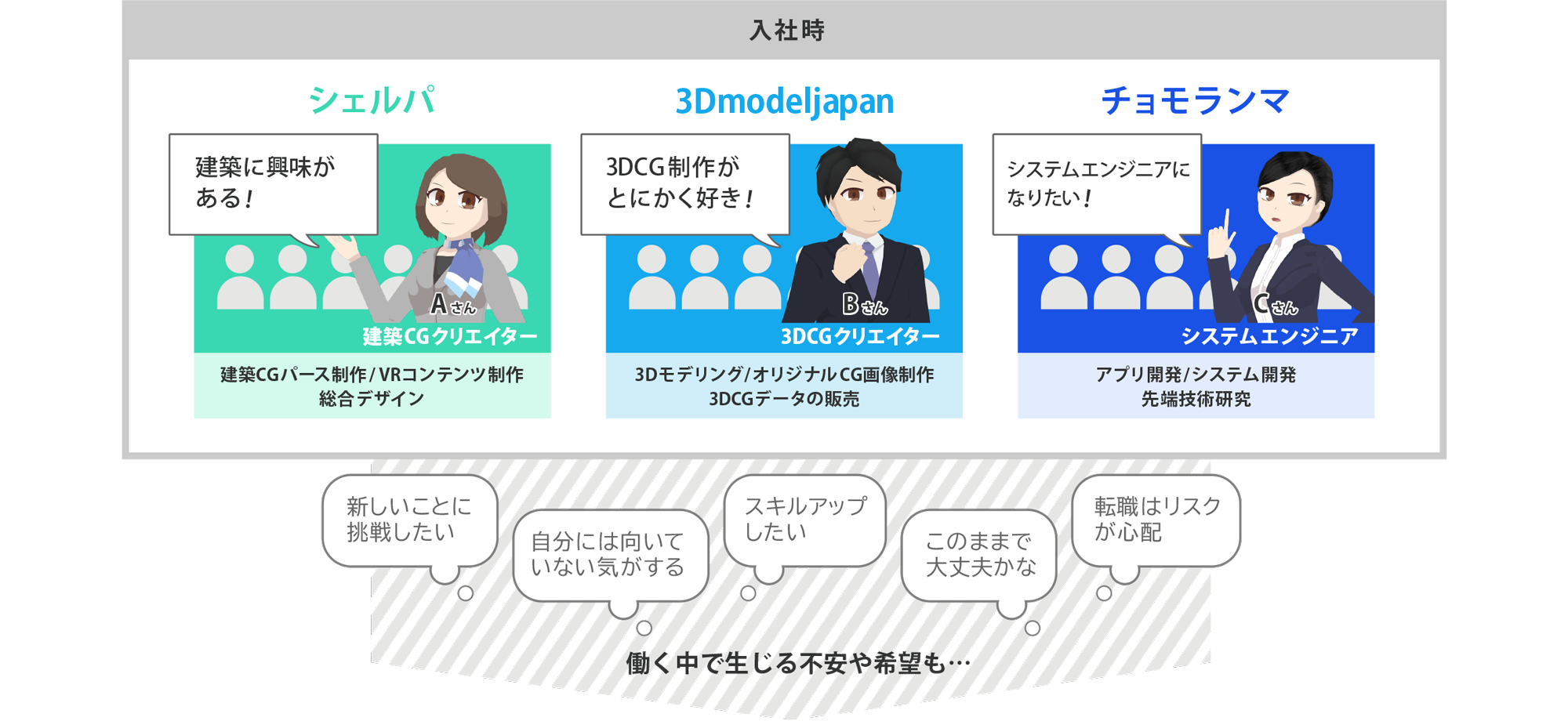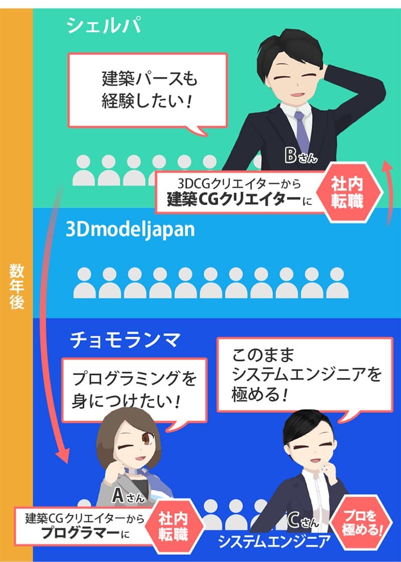 スキルアップし、やりたい仕事が増えた、変わったらジョブチェンジが可能です。