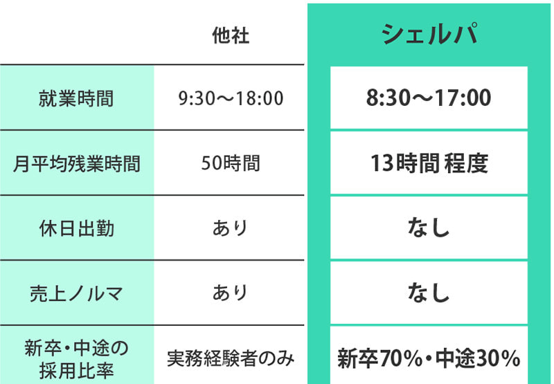 シェルパでは未経験・学歴を問いません!先輩社員の丁寧な指導と質問しやすい職場環境で、未経験で入社した社員も最短3ヶ月で実務部門への配属が可能です。