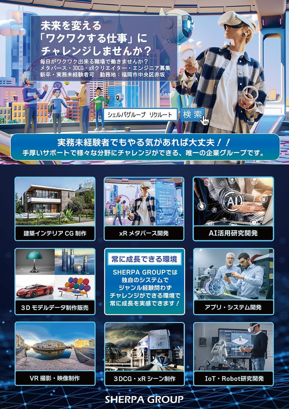 福岡を拠点に、建築3DCG制作、メタバース開発、xRコンテンツ開発、AI開発、アプリ開発まで手がける株式会社シェルパ、3Dmodeljapan株式会社、チョモランマ株式会社の3社から成るシェルパグループ(本社:福岡市中央区赤坂)が、今回は第5回目の開催になる自社開発の次世代WEBメタバースプラットホーム「SHERPA WORLD」を活用した業界初の会社説明会を2024年12月19日(木)に開催します。学生から社会人まで、学歴・経験問わず多様な職種の方々を対象に、メタバースとリアルが同時に体験できる新たな形の説明会が行われます。